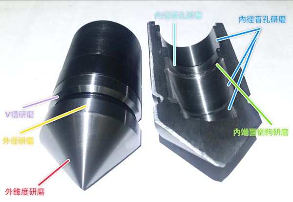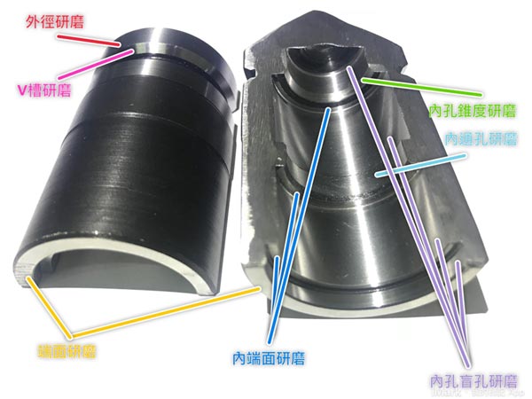 泰盛精密工業在高精密的研磨加工產業已經有超過二十年的經驗,研磨加工從手動內徑研磨(內圓研磨)機台到至今的CNC雙軸內徑研磨機台,追求創新與不斷提升設備來達到客戶對高精密與高速CNC研磨加工的高標準需求。以CNC數值控制可以達到更準確、更多功能加工以及從內直孔研磨、平面研磨、內錐度孔研磨、外徑研磨、外錐度研磨、深孔研磨等等。 可以一次性爪子的夾持下完成,並達到尺寸公差0.005mm,表面粗度可達Ra0.3、同心度保持在0.003mm。泰盛使用精密量測儀器與工具來保持工件的的穩定性,也是在泰盛對於設備、技術的堅持下讓品質、效率保持在最專業的加工。